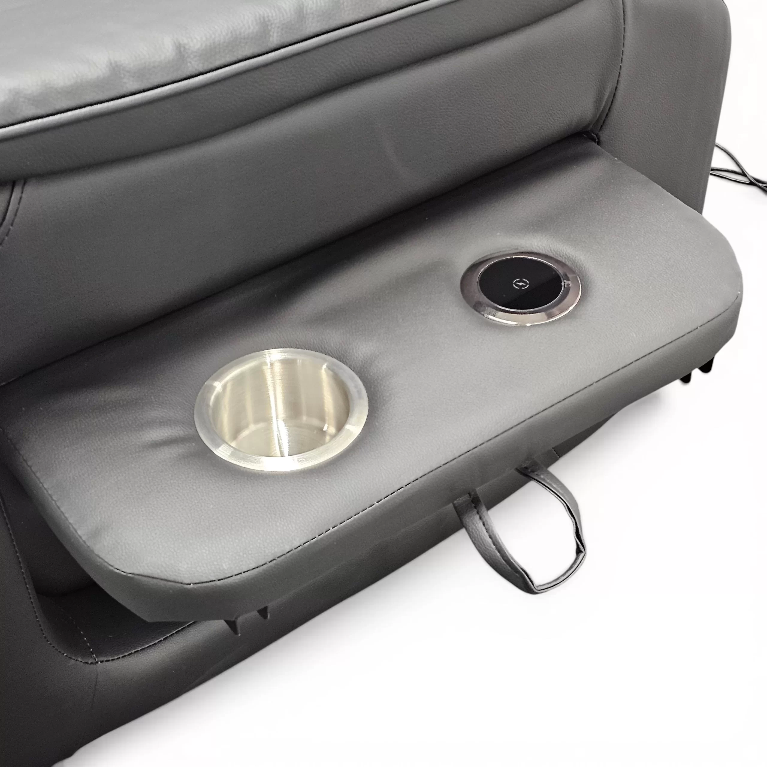 Tuolin sivusta avautuva pöytä tuo lisää käytännöllisyyttä arkeen. Pöydässä on langaton lataus sekä mukiteline, ja sen saa tarvittaessa helposti esiin tai piiloon.