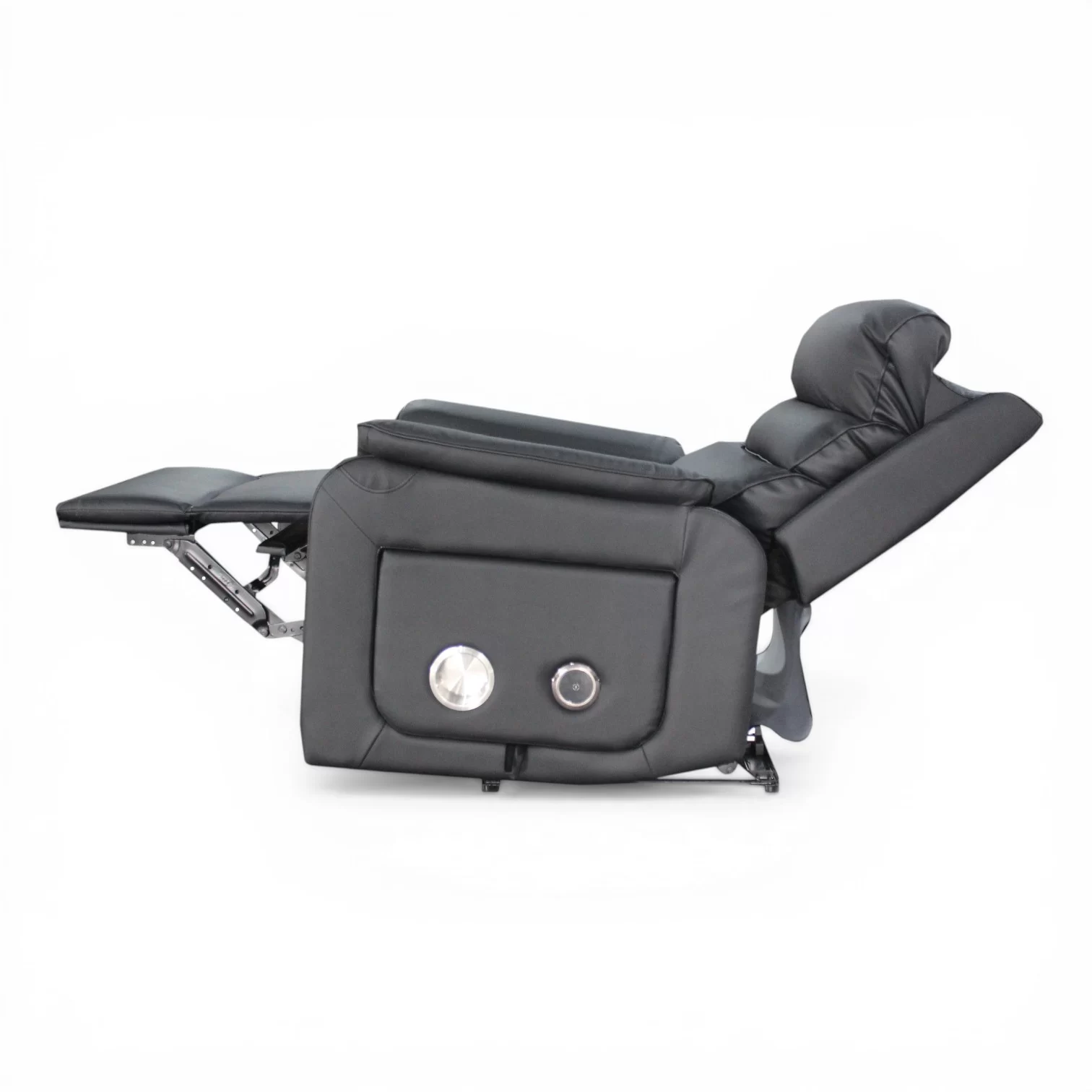 Sivussa olevista painikkeista säädät jalkarahia ja niskatukea sekä palautat tuolin yhdellä napilla perusasentoon.